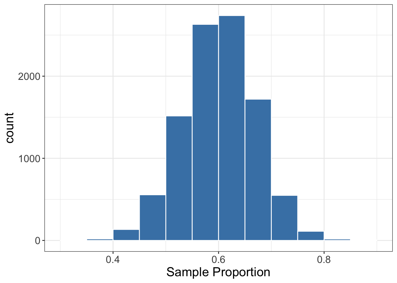 Fortunately, for the tests discussed in this book, this adjustment does not affect the results of the hypothesis test. Therefore, the procedure we will follow remains the same whether we use H_0: p = 0.6 or H_0: p \leq 0.6. For this reason, in this book, we will always express the null hypothesis using the equal sign as follows: H_0: p = p_0.