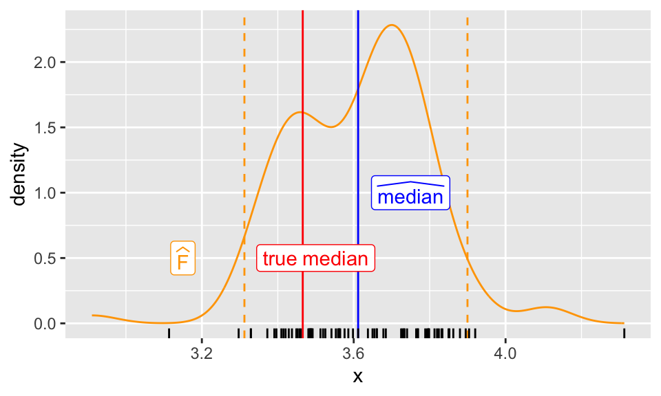 ggplot(data.frame(median_bootstrap), aes(median_bootstrap)) +geom_density(color ="orange") +geom_vline(xintercept = CI, color ="orange", linetype =2) +geom_vline(xintercept = med, col ="blue") +geom_vline(xintercept =qexp(.5, 1/5), col ="red") +annotate("label",x =c(3.15, 3.5, 3.75), y =c(.5, .5, 1),color =c("orange", "red", "blue"),label =c("widehat(F)", "true~median", "widehat(median)"),parse =TRUE ) +xlab("x") +geom_rug(aes(2* med - median_bootstrap))