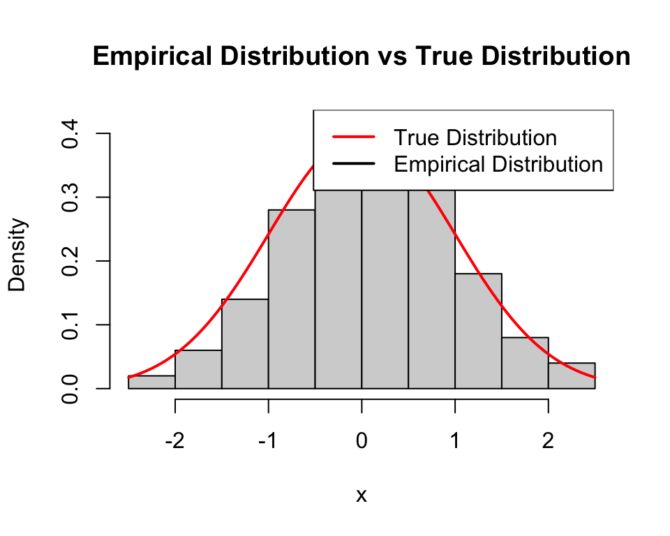 set.seed(1)n <-100x <-rnorm(n)hist(x, probability =TRUE, breaks =10, main ="Empirical Distribution vs True Distribution")curve(dnorm(x), col ="red", add =TRUE, lwd =2)legend("topright", legend =c("True Distribution", "Empirical Distribution"), col =c("red", "black"), lwd =2)
