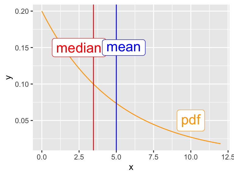 library(tidyverse)ggplot(data.frame(x =c(0, 12)), aes(x)) +stat_function(fun =function(x) dexp(x, 1/5), color ="orange") +geom_vline(xintercept =5, color ="blue") +# meangeom_vline(xintercept =qexp(.5, 1/5), color ="red") +# medianannotate("label",x =c(2.5, 5.5, 10), y =c(.15, .15, .05),label =c("median", "mean", "pdf"), parse =TRUE,color =c("red", "blue", "orange"), size =6 )