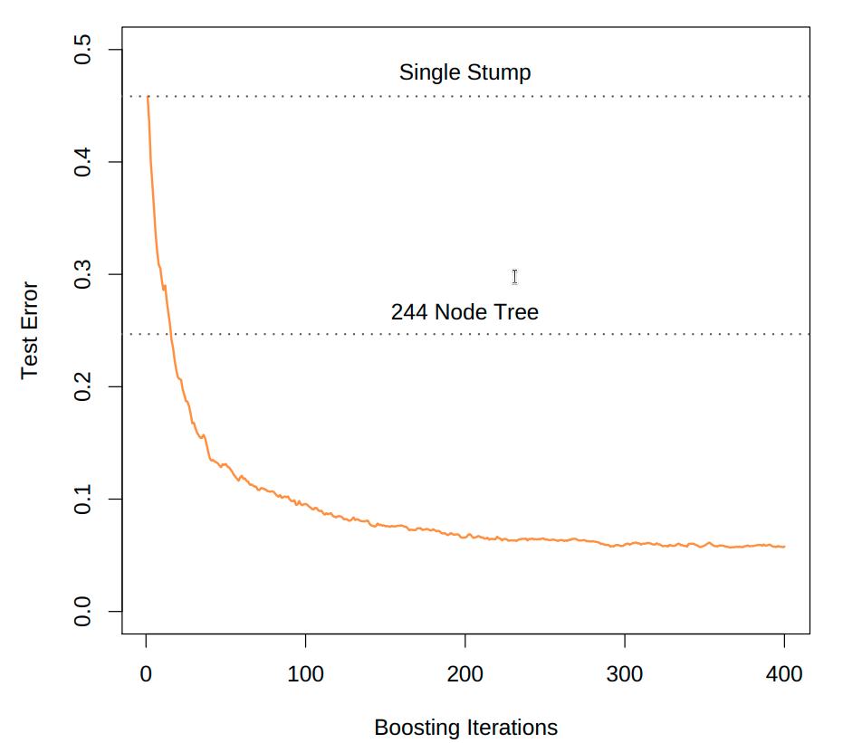 - AdaBoost has remarkable theoretical properties: it can drive training error to zero in \(O(\log n)\) iterations.
