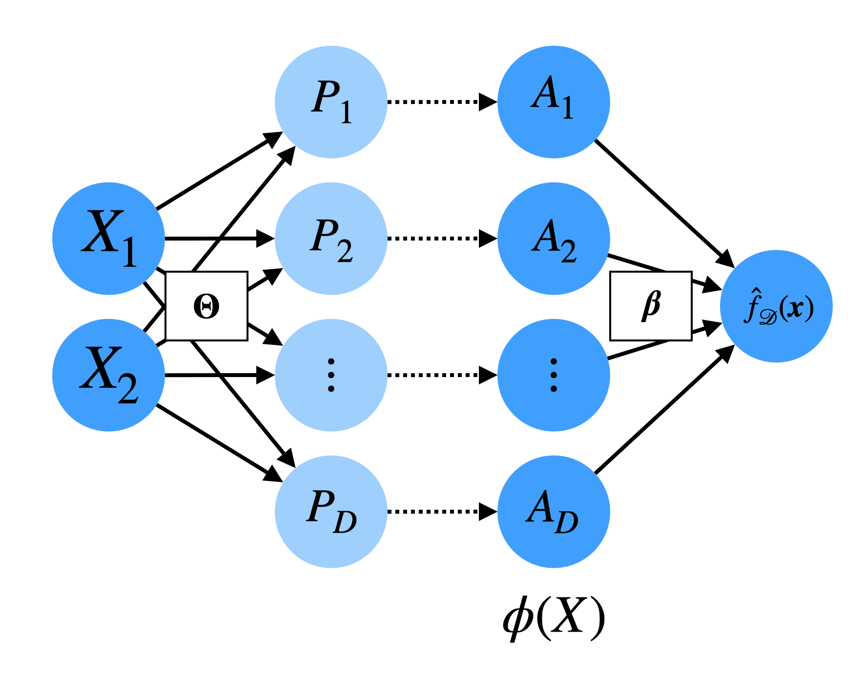 - These basis functions come from \(L\) layers of linear combinations and non-linear activations, each of which has many learnable parameters \(\Theta^{(1)}, \ldots, \Theta^{(L)}\).