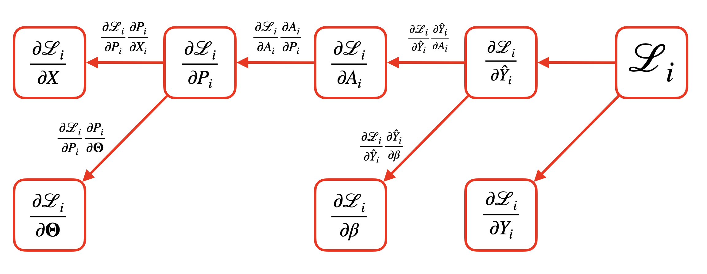 - \(\frac{\partial \mathcal L_i}{\partial A_i} = \frac{\partial \mathcal L_i}{\partial \hat Y_i} \underbrace{\frac{\partial \hat Y_i}{\partial A_i}}_{\beta^\top}\)