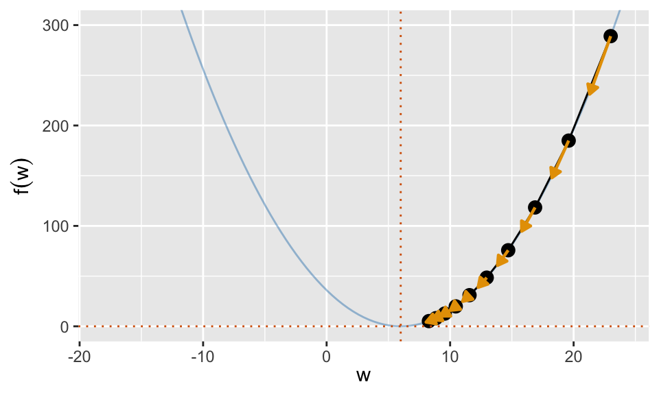 - Our initial guess is \(w_0 = 23\) and we use a step size of \(\gamma = 0.1\).