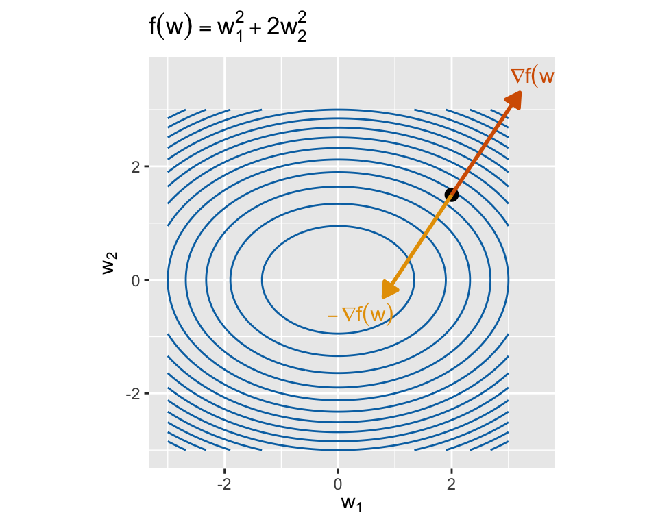 - If we update \(w\) in the negative gradient direction \(-\nabla f(w)\), we are moving \(w\) in the most efficient direction to reduce \(f(w)\).