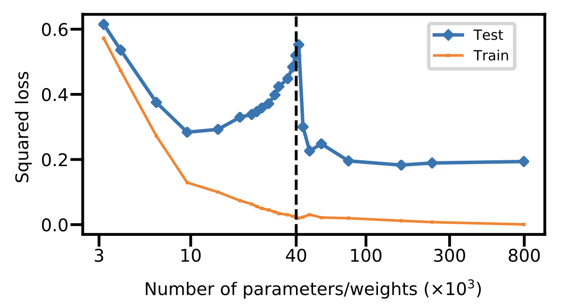 - Initially (on the left side of the plot), we observe the expected U-shaped bias-variance curve. As we increase the number of parameters, the test error first decreases (as bias decreases), then increases (as variance increases).