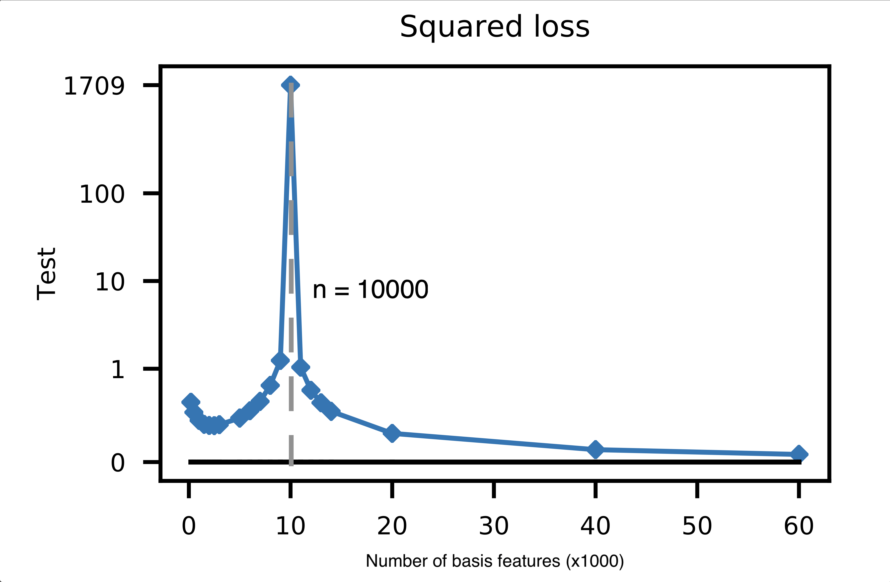 Consider a basis regression model with an increasing number of basis functions \(d\). As we increase \(d\) beyond the number of training examples \(n\), we observe the same double descent curve: