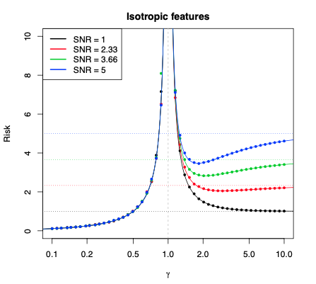 - As we increase \(d\), we have more and more features, which means the noise gets “spread out” over more parameters.