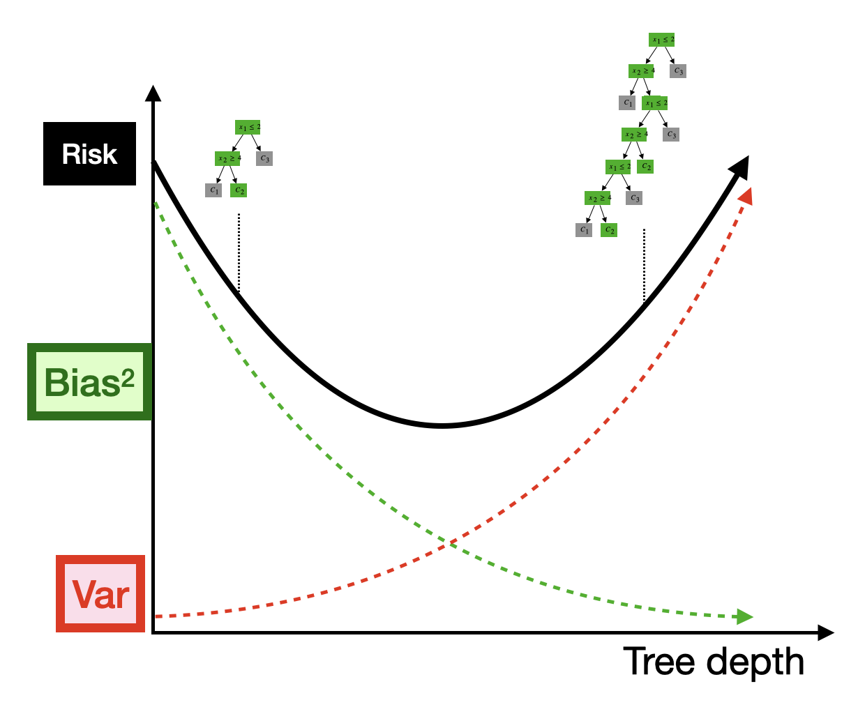 - When the tree is deep (many parameters), the model has low bias but high variance.