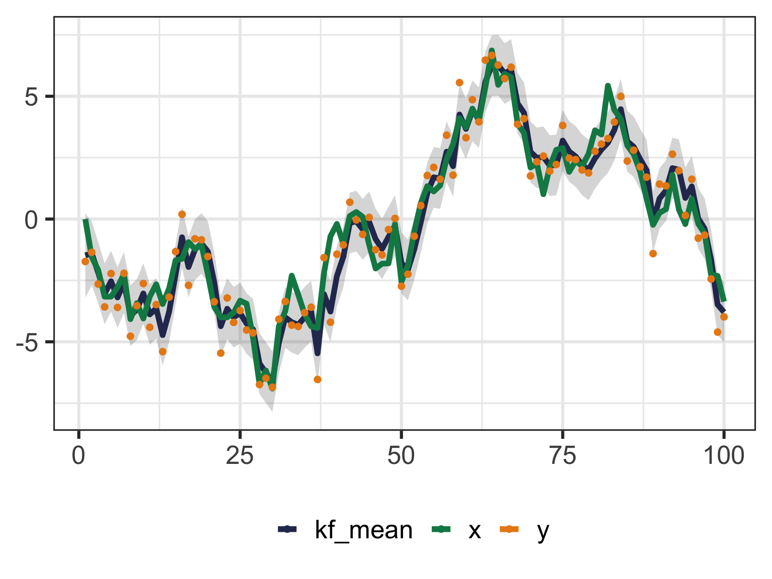 kalman <-function(y, m0, P0, A, Q, H, R) { n <-length(y) m <-double(n+1) P <-double(n+1) m[1] <- m0 P[1] <- P0for (k inseq(n)) { mm <- A * m[k] Pm <- A * P[k] * A + Q v <- y[k] - H * mm S <- H * Pm * H + R K <- Pm * H / S m[k+1] <- mm + K * v P[k+1] <- Pm - K * S * K }tibble(t =1:n, m = m[-1], P = P[-1])}set.seed(2022-06-01)x <-double(100)for (k in2:100) x[k] = x[k -1] +rnorm(1)y <- x +rnorm(100, sd =1)kf <-kalman(y, 0, 5, 1, 1, 1, 1)