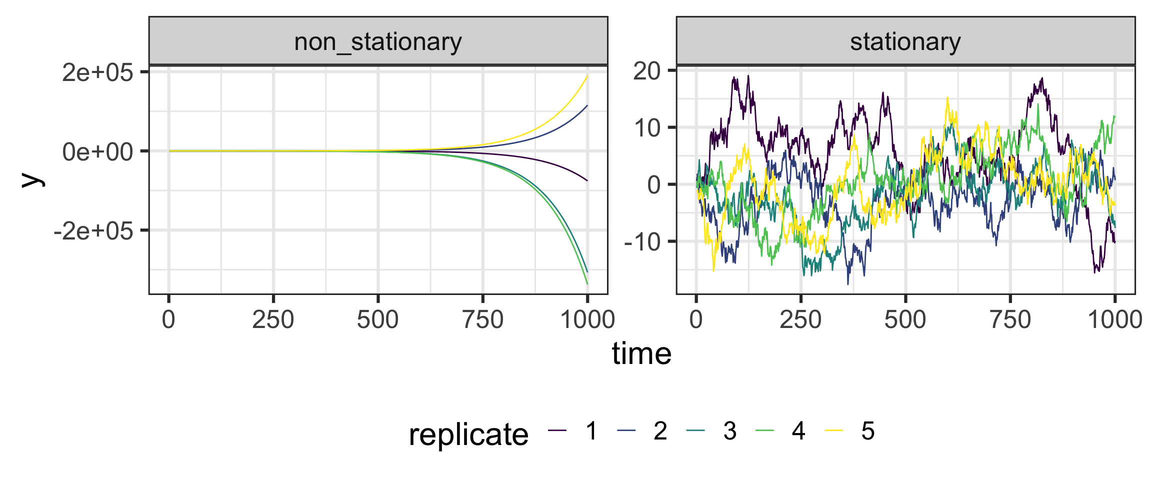 n <-1000set.seed(12345)nseq <-5generate_ar <-function(id, n, b) { y <-double(n) y[1] <-rnorm(1)for (i in2:n) y[i] <- b * y[i -1] +rnorm(1)tibble(time =1:n, y = y, id = id)}stationary <-map_dfr(1:nseq, ~generate_ar(.x, n = n, b = .99))non_stationary <-map_dfr(1:nseq, ~generate_ar(.x, n = n, b =1.01))