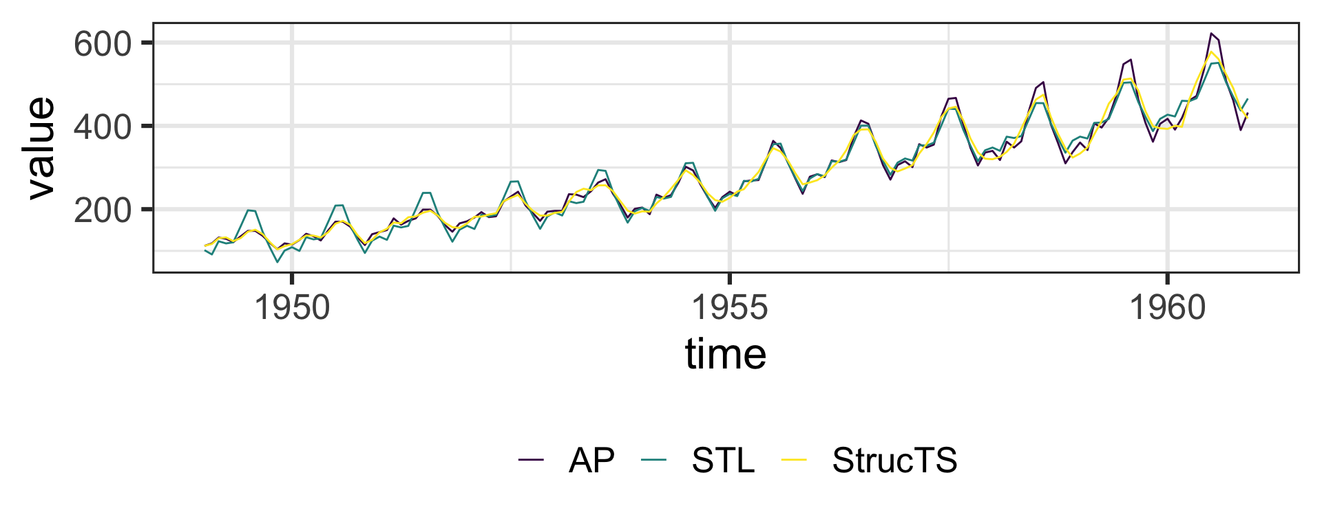 sts <-StructTS(AirPassengers)bc <-stl(AirPassengers, "periodic") # use sin/cos to represent the seasonaltibble(time =seq(as.Date("1949-01-01"), as.Date("1960-12-31"), by ="month"),AP = AirPassengers, StrucTS =fitted(sts)[,1], STL =rowSums(bc$time.series[,1:2])) %>%pivot_longer(-time) %>%ggplot(aes(time, value, color = name)) +geom_line() +theme_bw(base_size =24) +scale_color_viridis_d(name ="") +theme(legend.position ="bottom")