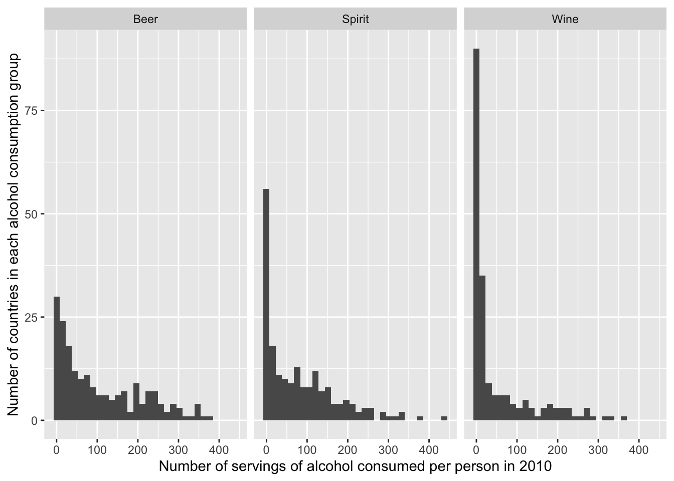 The fivethirtyeight R package contains a dataset called drinks. This dataset was compiled as part of a FiveThirtyEight article that explored (among other things) which countries consumes the most alcohol. Let’s look at a subset of the data: