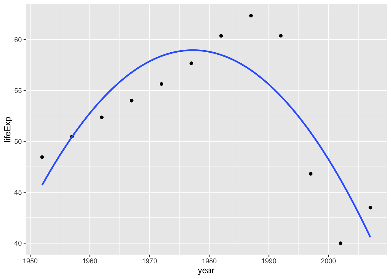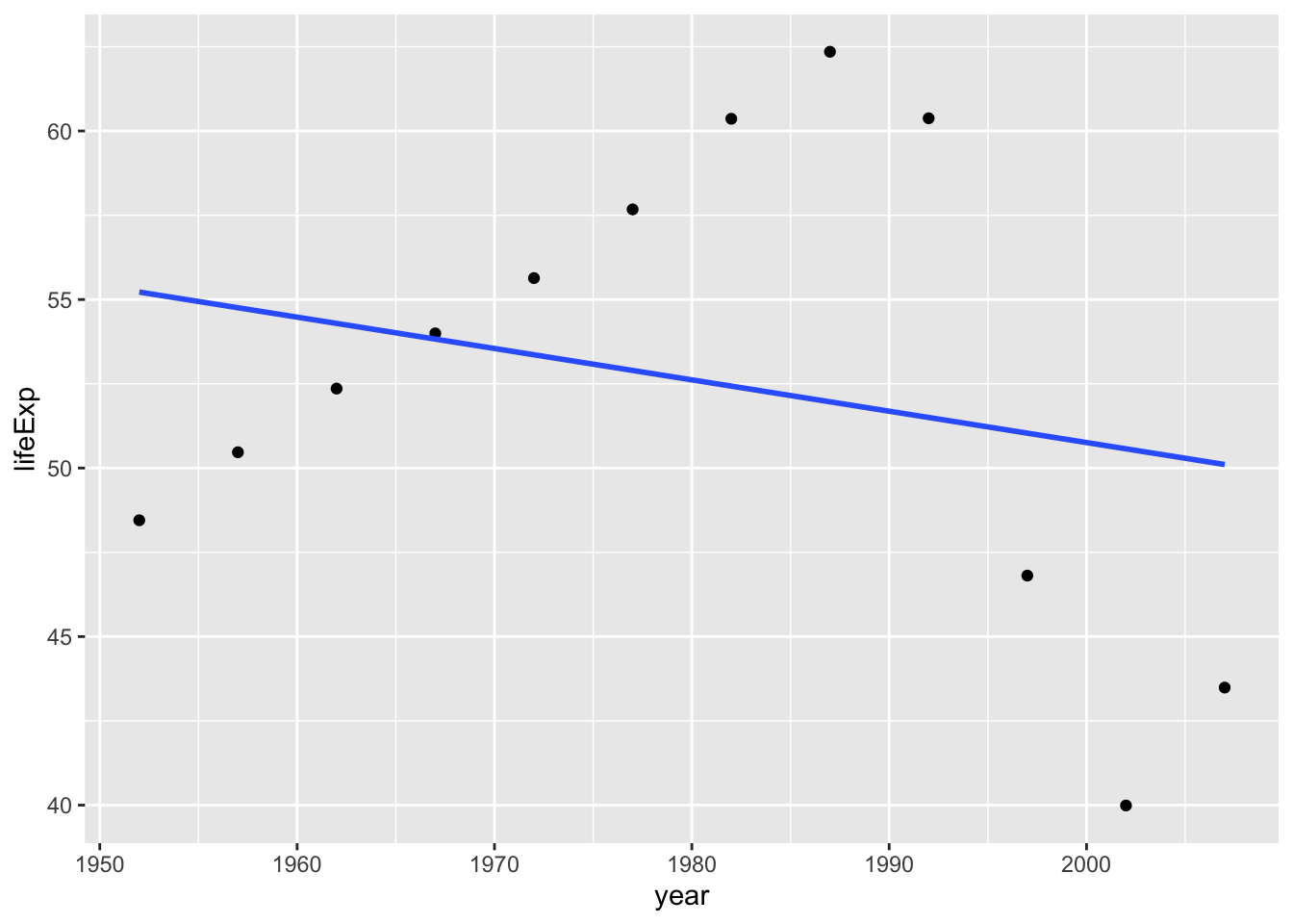 Let’s inspect Zimbabwe, which has a unique behavior in the lifeExp and year relationship.