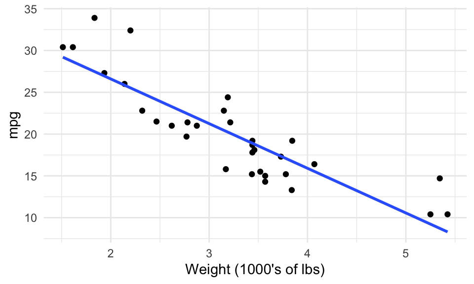 A simple scatterplot will give us a general idea, but can’t give us specifics. Here, we use the mtcars dataset in the datasets package. A linear model is one example of a model that can attempt to answer all three – the line corresponding to the fitted model has been added to the scatterplot.