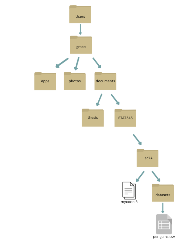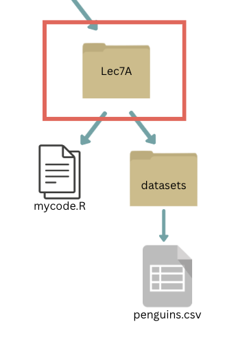 I could always read in my penguins dataset using an absolute file path where the file path begins at the root of your computer. Consider the following file structure: